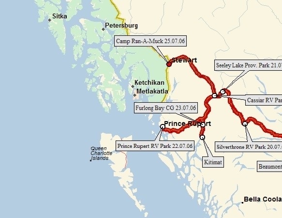 In dieser Woche fahren wir zu unserem letzten großen Ziel, dem kleinen Städtchen Hyder in Alaska. Wir kommen Hunderte von Kilometern durch einsame Wildnis, vorbei an den typischen Landschaften Kanadas, Bergen, Wäldern und Seen. Viele interessante und sehr unterschiedliche Dinge begegnen uns dabei, wir machen Touren durch zwei große Industriebetriebe, schauen Indianern beim Lachs Fischen zu und schlendern durch ein altes Fischerdorf. Schließlich erreichen wir Hyder und sehen unsere ersten Bären (davon nächste Woche mehr!).